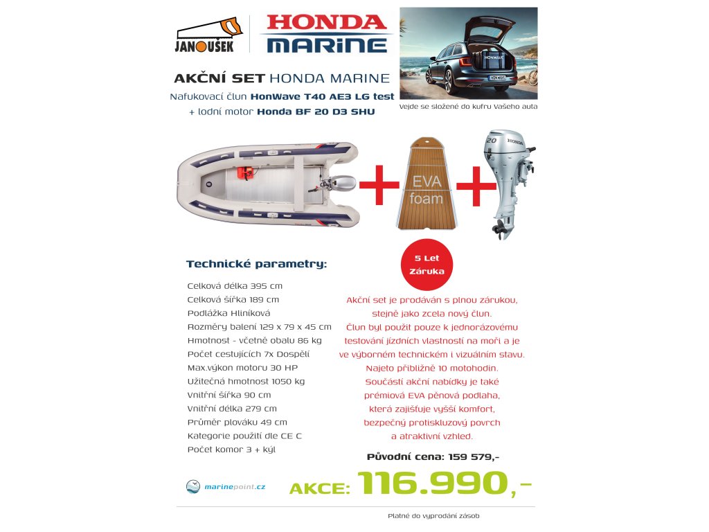 ...a to přesně platí pro HonWave T40-AE3, jednoho z nejůspěšnějších a velmi oblíbených nafukovacích člunů v nabídce Hondy. Dostane se Vám do rukou špičkově propracovaný nafukovací člun v celkové délce 4 m s hliníkovou skládací podlážkou, který hravě zvládne téměř všechny vodní aktivity a jakékoliv povětrnostní podmínky. Tyto pevné a lehké hliníkové segmenty podlážky pohlcují vibrace, poskytují vysokou dávku jistoty postoje na palubě člunu, pohodlí a do jisté míry zklidní plavbu na zvlněných vodních hladinách. Pod hliníkovou podlahou člun ukrývá nafukovací kýl. Ten člunu zaručuje přesnou řiditelnost a směrové ovládání při rychlé plavbě i v zatáčkách. Vnitřní rozměry člunu, kde délka paluby činí téměř 2,8m a šířka necelý 1m umožňují naložit na palubu i větší množství rozličného vybavení, třeba pro potápění. Není problémem tento člun využívat i v záchranných složkách jako jsou hasiči a pod. Díky velkému průměru obvodového plováku, které patří mezi největší na trhu, je zajištěna skvělá plovatelnost a stabilita člunu na hladině. Použitý materiál člunu je vrstvené PVC, chemicky spojované lepením za studena a odolné vůči vlivu povětrnostních podmínek a slunečního záření. Jsou pevné a odolné. Navíc je obvodový tubus rozdělen flexipřepážkami tak, aby se tlak v tubusech rovnoměrně rozložil, ale v případě nehody a poškození tubusu zůstávají ostatní komory nafouknuty. Tato konstrukce značně přispívá k bezpečnosti plavby. Nafukovací ventily jsou bezpečnostní konstrukce, která zabraňuje samovolnému vyfouknutí tubusu při plavbě. V místech pro uvazování člunu při kotvení je povrch tubusu zesílen plastovou výztuhou tak, aby úvazové lano nepoškodilo strukturu tubusu. Sklolaminátové čelo pro montáž závěsného lodního motoru je dokonale slícováno s tubusy a je dostatečně pevné pro dokonalý přenos hnací síly od motoru na konstrukci člunu. Pro komfort plavby a pobytu posádky v člunu přispívá důmyslné umístění nouzových pádel z vnitřní strany tubusů, a přehledně umístěné obvodové úchopy pro bezpečnost posádky. Celkový design je navrhován tak aby celek člunu s motorem Honda dokonale ladily. Člun je v základním provedení dodáván s transportním obalem, sedačkou, dvěma nouzovými pádly, nožní pumpou, vázacím lanem a malou sadou na drobné opravy člunu, obsahující manometr, klíč na ventily, lepidlo a záplatu.