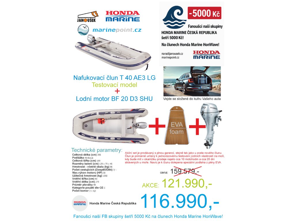 HonWave T40-AE3 je největším člunem z nabídky Honda Marine. Jedná se o velmi robustní, odolný a velmi stabilní, 4m dlouhý nafukovací člun s rovnou hliníkovou podlahou a nafukovacím kýlem. Ideálním doplněk pro rodinnou dovolenou u vody a s motorem Honda BF20 překoná i mírně neklidnou hladinu příbřežních mořských vod. Svojí velikostí již umožňuje se vydat na delší projížďku nebo vzít sebou lehčí výbavu pro šnorchlování pro průzkum pobřeží nebo i větší potápěčskou výbavu. Svojí délkou člun zaručuje při plavbě neustále pocit jistoty a bezpečí.